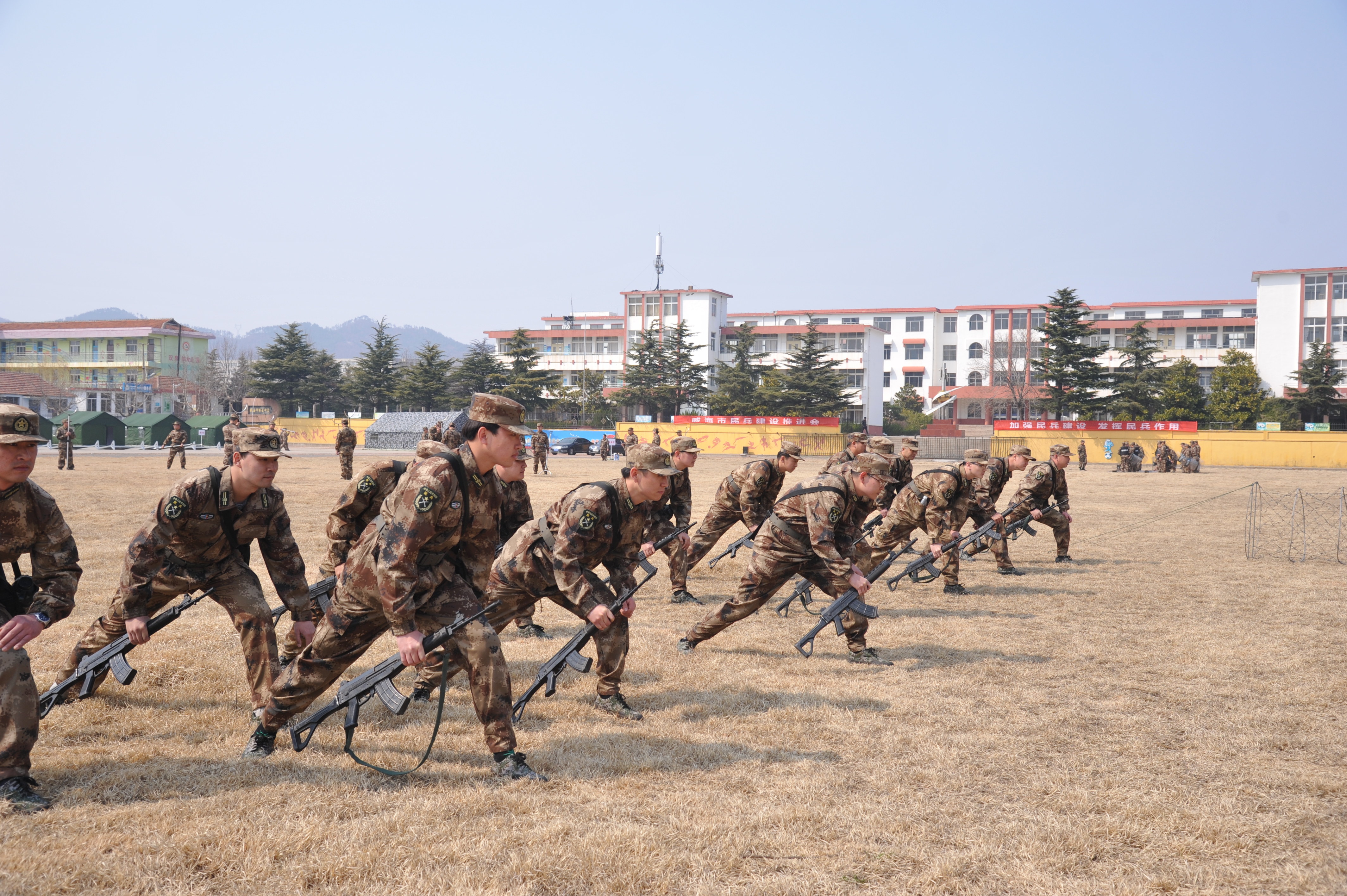 根據(jù)政府辦公室通知要求,為積極響應(yīng)威海軍分區(qū)關(guān)于我市民兵建設(shè)推進(jìn)總體部署,全面提升集團(tuán)公司在冊(cè)民兵的軍事技能和應(yīng)急處置能力,3月24日至4月2日,集團(tuán)公司按比例抽調(diào)黨員干部、退役士兵及青年職工60人參加民兵軍事訓(xùn)練。此次訓(xùn)練為期10天,以應(yīng)急防暴、海岸巡邏、罪犯抓捕、消防滅火、戰(zhàn)術(shù)隊(duì)形、旗語信號(hào)和實(shí)彈射擊等為訓(xùn)練內(nèi)容,采取民兵應(yīng)急連編制,開展集中脫產(chǎn)訓(xùn)練。