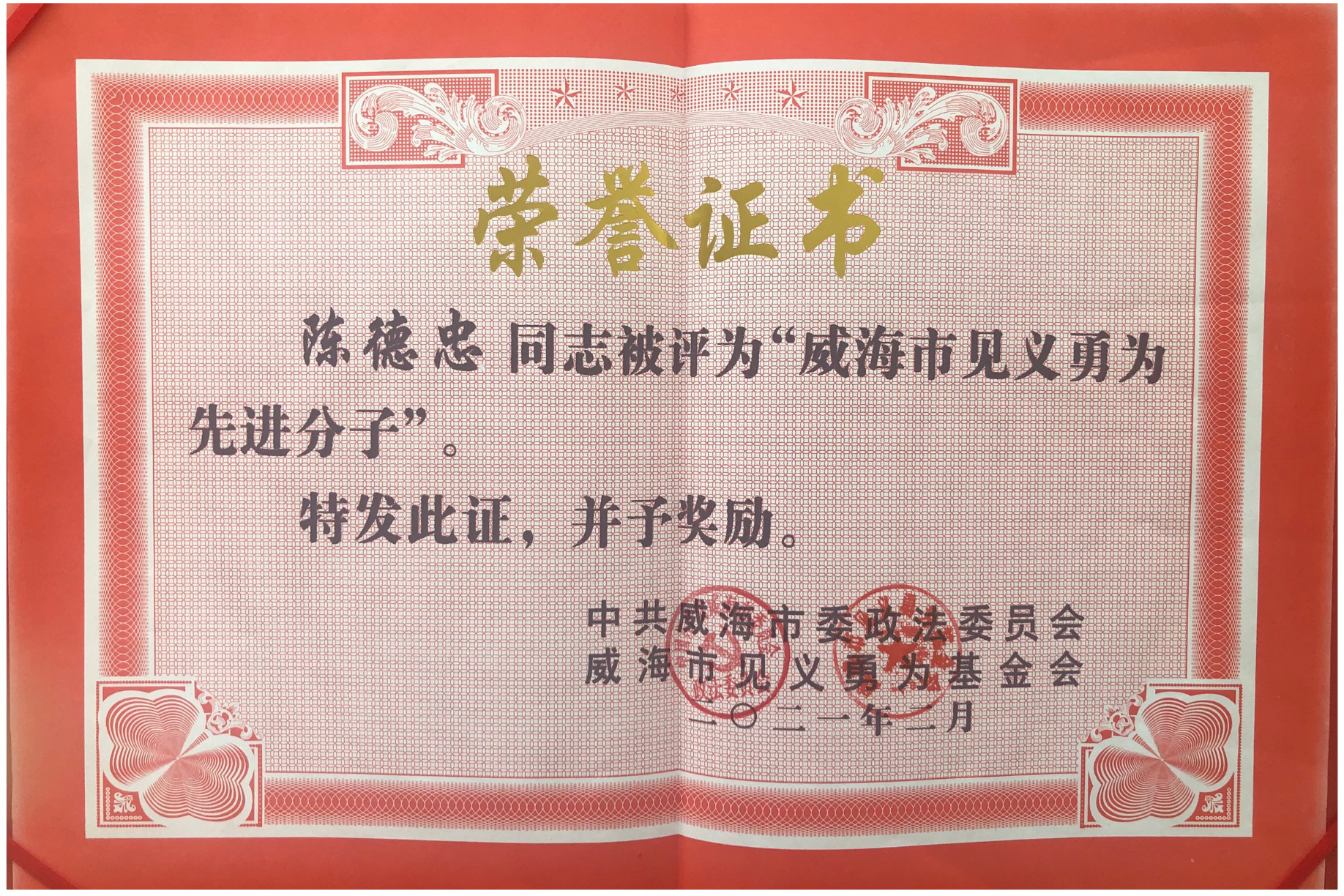 市水務(wù)集團(tuán)羊亭轄區(qū)保安陳德忠被授予“威海市見義勇為先進(jìn)分子”榮譽(yù)稱號